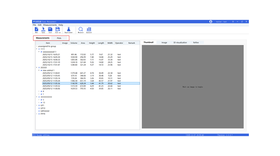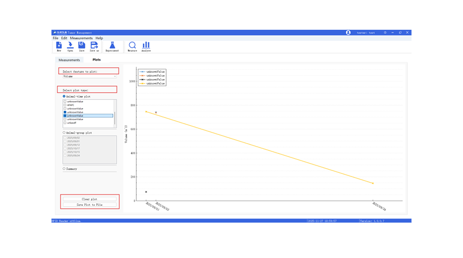 多功能软件,一键分析:可实现肿瘤图像的采集与数据的计算、统计并绘制单只或多只动物的肿瘤体积变化图,便于后续的数据分析。