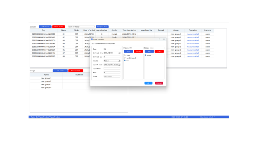 支持新建、导入、保存、导出实验,可编辑实验信息、动物分组(含随机分组功能)、笼具信息;