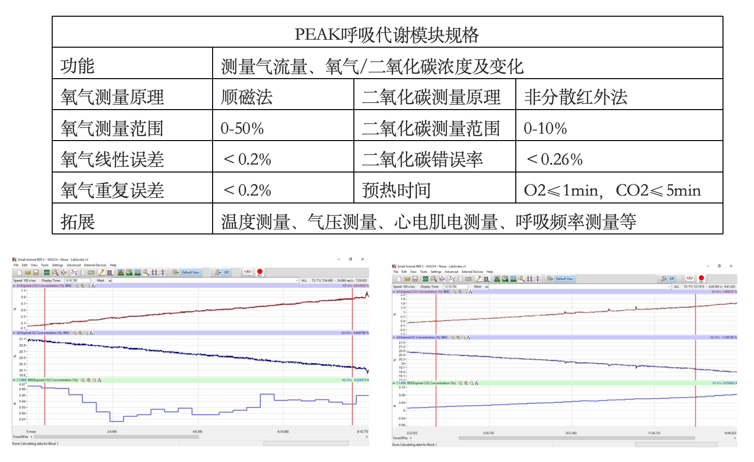 测量参数:基础代谢率(BMR)、休息代谢率(RMR)、呼吸交换比(RER)、 安静或轻微活动时 VO2 和 VCO2、VO2 Max ;搭配相应传感器,可拓展肺流量、体温、心率、脉搏、血氧、心电、肌电等测量功能