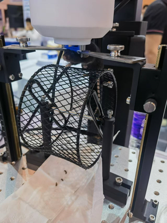还可以加配跑轮,在小鼠运行状态下配合双光子显微镜对脑室进行成像和观察: