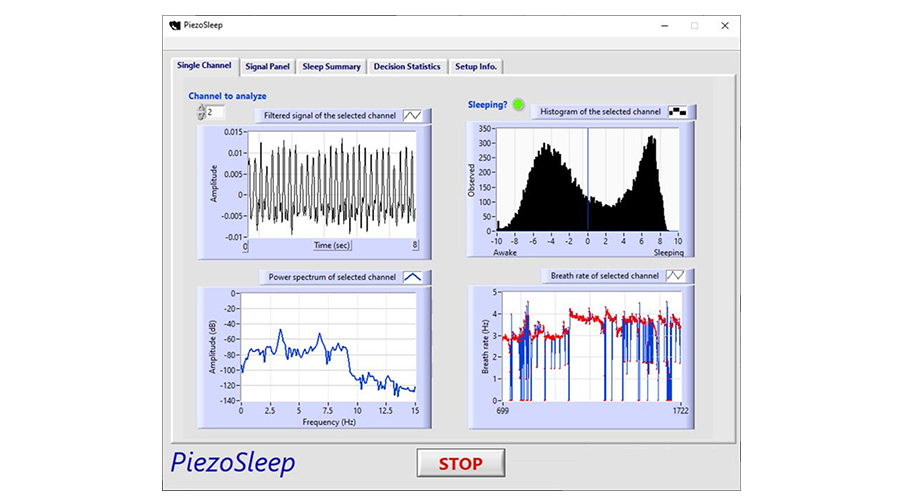 无创睡眠监测系统通过高精度压电传感器感受动物粗大及精细活动状态(运动、饮食、梳理、呼吸节律等),结合软件处理算法,自动获得动物睡眠节律数据。采集软件实时显示监测原始波形图、信号频谱图、睡眠/觉醒行为图、呼吸频率图,分析软件可分析获得睡眠活动图、呼吸波形图、每日睡眠统计图、光照/黑暗睡眠统计图等统计图表。系统选型