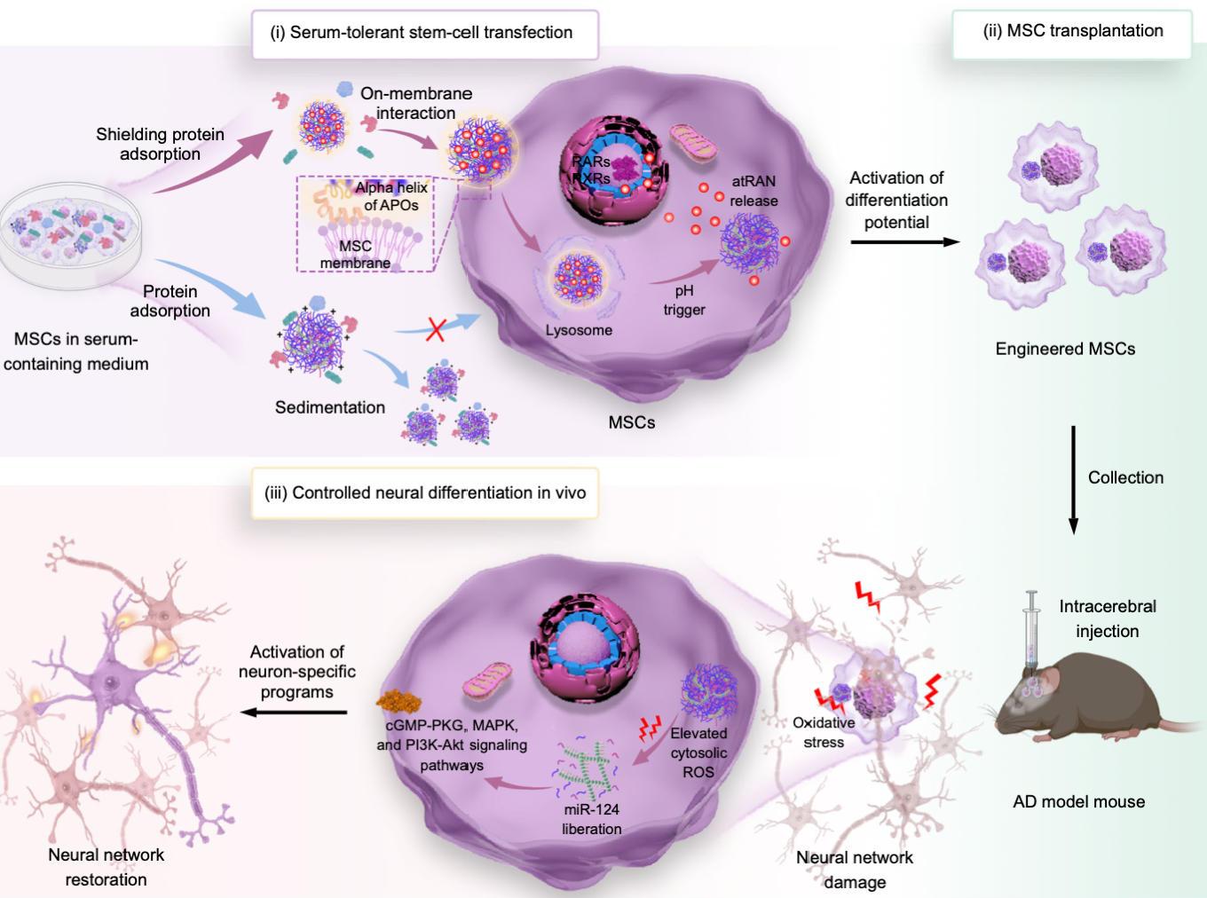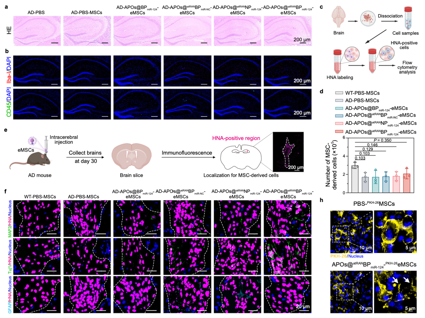 研究并未止步于递送效率验证,而是进一步构建了多功能治疗系统:将促神经分化的miR-124与可诱导神经分化的全反式维甲酸纳米颗粒(atRANP)共载于APOs@BP,形成APOs@atRANBP/miR-124-eMSCs。在体外实验中,该系统成功激活MSCs的神经元分化通路。而在更具挑战性的APP/PS1阿尔茨海默病小鼠模型中,研究者通过脑立体定位注射将工程化MSCs精准递送至海马区——这是记忆与认知功能的关键脑区,也是AD病理损伤最严重的区域之一。